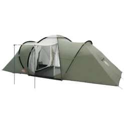 Das Ridgeline Plus von Coleman für 6 Personen ist ein großes und komfortables Kuppelzelt mit 2 separaten Schlafkabinen, dazwischen liegt der Wohnbereich. Das Zelt hat zwei Eingänge, zwei Ventilationsklappen, zwei Innentaschen, einen Kabelschlitz, eine wasserdichte Bodenwanne und das Zeltmaterial ist schwer entflammbar.