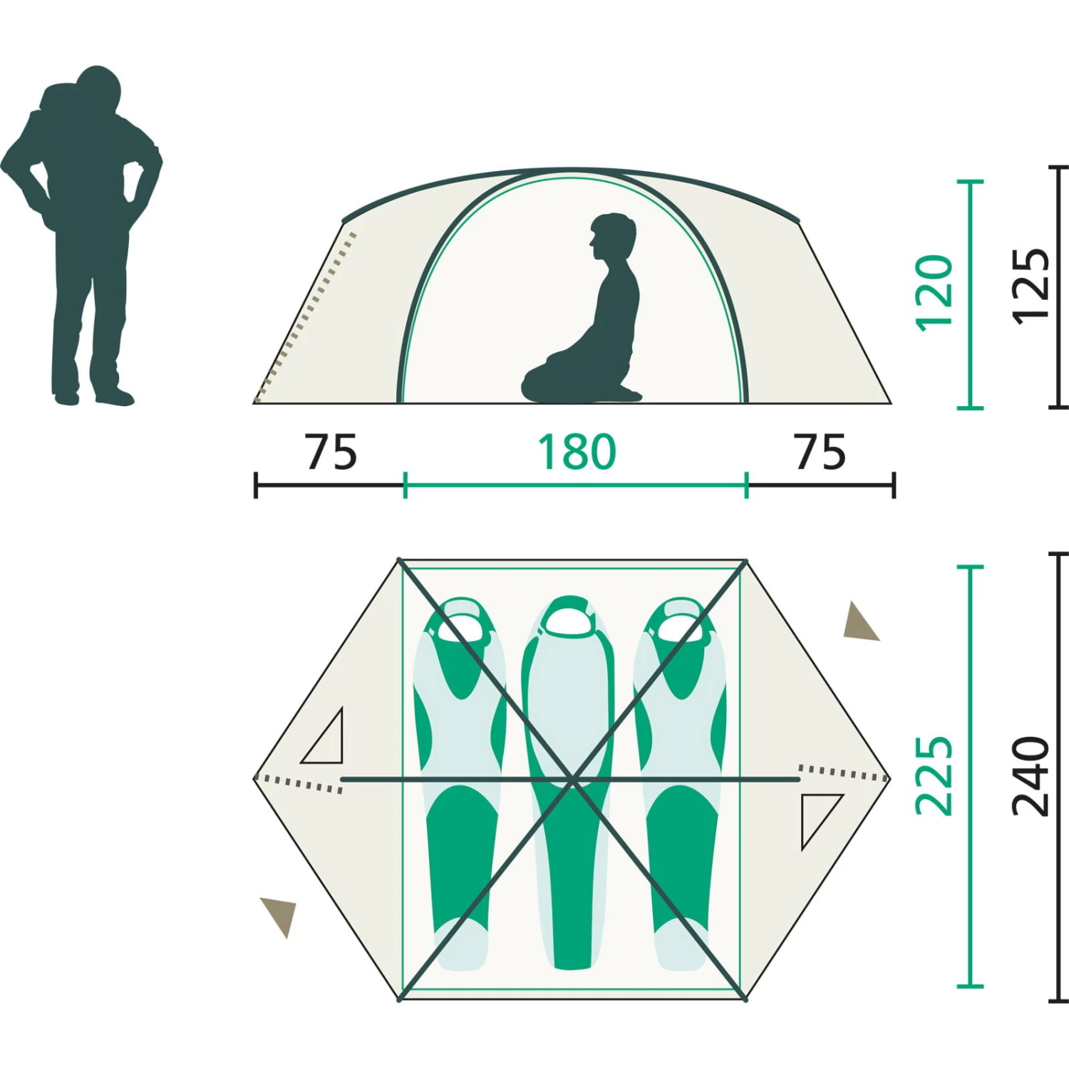 Das Eclipse III von Jack Wolfskin ist ein unkompliziertes, freistehendes Kuppelzelt für drei Personen, das zu einem großen Teil aus recycelten Materialien besteht. An jeder Längsseite hat das Zelt einen Eingang mit Apsis und Fenster, so dass es gut belüftet werden kann. Bei geschlossenen Türen versorgen zwei Lüftungsöffnungen im Dach das Zelt mit frischer Luft. In vier Innentaschen können Kleinteile verstaut werden. Für den Aufbau der freistehenden Konstruktion werden nur wenige Heringe und Abspannleinen benötigt – optimal bei sehr hartem Untergrund. Im Sommer kann das Innenzelt auch ohne Außenzelt verwendet werden.
