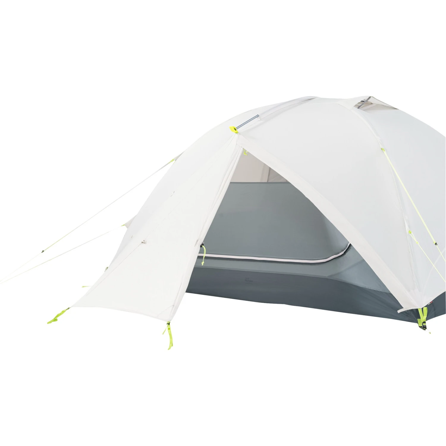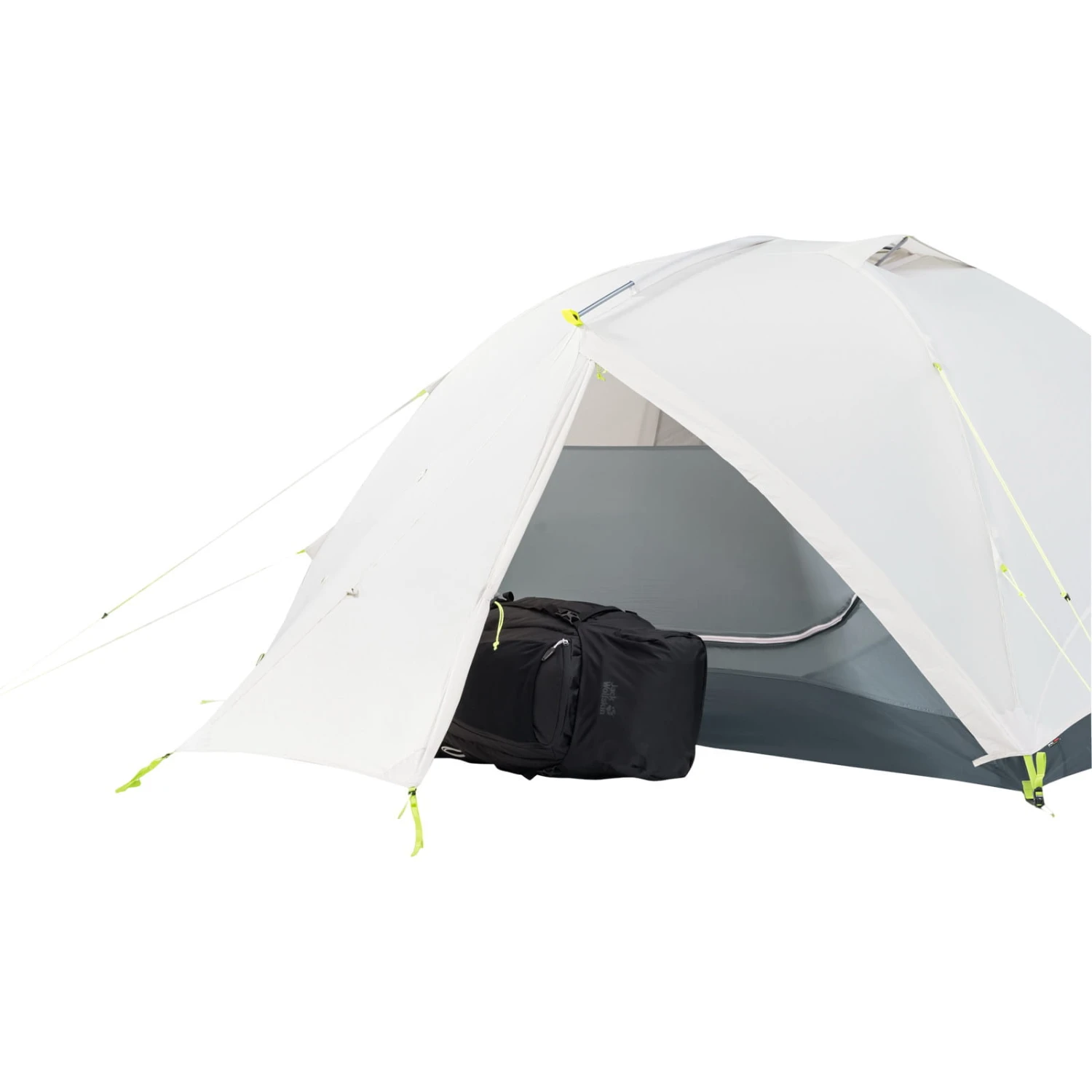Das Real Dome Lite II von Jack Wolfskin ist ein freistehendes Kuppelzelt für zwei Personen, das zu einem großen Teil aus recycelten Materialien besteht. An jeder Längsseite hat das Zelt einen Eingang mit Apsis, so dass es gut belüftet werden kann. Bei geschlossenen Türen versorgen zwei Lüftungsöffnungen im Dach das Zelt mit frischer Luft. In vier Innentaschen können Kleinteile verstaut werden. Für den Aufbau der freistehenden Konstruktion werden nur wenige Heringe und Abspannleinen benötigt – optimal bei sehr hartem Untergrund. In trockenen Nächten kann das Innenzelt auch ohne Außenzelt verwendet werden.