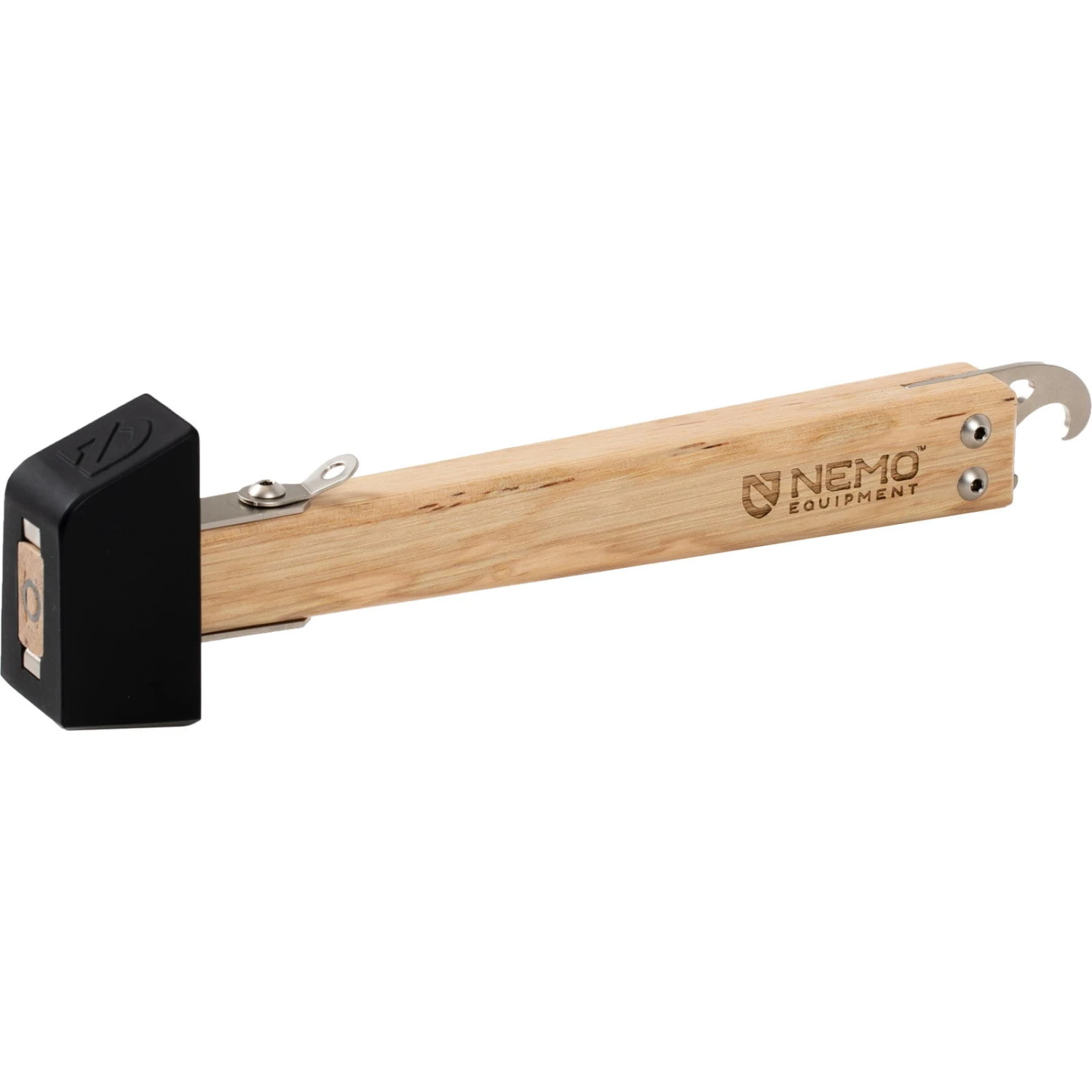 Der Meldr verbindet die Handwerkskunst aus der NEMO-Holzwerkstatt mit einem Hammer für Heringe, und ist markantes Lagerwerkzeug in Erbstückqualität. Der massive Edelstahlgusskopf wird mit Spezialbeschlägen am kunstvoll verjüngten, perfekt ausbalancierten Holzstiel verankert. Ein neues ergonomisches Design und eine schräge Schlagfläche erleichtert das Eintreiben von Heringen oder Pfählen. Die Ästhetik des Hammers wird durch einen Flaschenöffner in Form eines Redtail Hawk vervollständigt, der auch zum Ziehen von Heringen aus dem Boden geeignet ist.