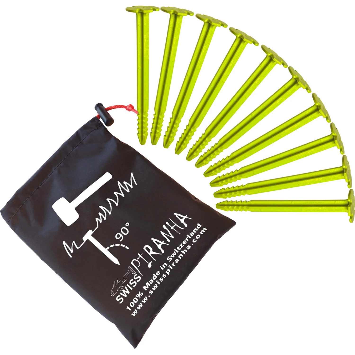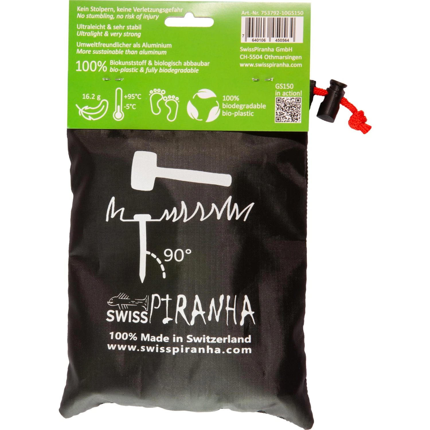 Innovativ und in der Schweiz hergestellt, bieten die veganen Heringe aber noch weitere Vorteile. Sie sind ultraleicht, stoßfest, supersicher und aufgrund ihres flachen Profils besonders fußfreundlich. Ihre spitz zulaufende Form ermöglicht ein einfaches Einschlagen, ohne dass scharfe Kanten entstehen, die das Zeltgewebe beschädigen. Ihr x-förmiger Querschnitt mit Sägezahnprofil sorgt für sicheren Halt in unterschiedlichsten Böden. SwissPiranha-Heringe werden flach im Boden versenkt, wodurch keine Stolper- und Verletzungsgefahr besteht. Ideal für Familien, da sich spielende Kinder nicht am Hering verletzen können. Zusätzlich verdichtet der flache Kopf den Untergrund und sorgt so für eine deutlich höhere Ausreißkraft. Einkerbungen halten die Zeltleinen zuverlässig am Platz und sorgen für beste Verankerung. Ausgediente GreenShark-Heringe können wieder recycelt werden und sind sogar biologisch abbaubar und kompostierbar. Die Zeltheringe GS150 werden im praktischen Stoff-Packsack geliefert.