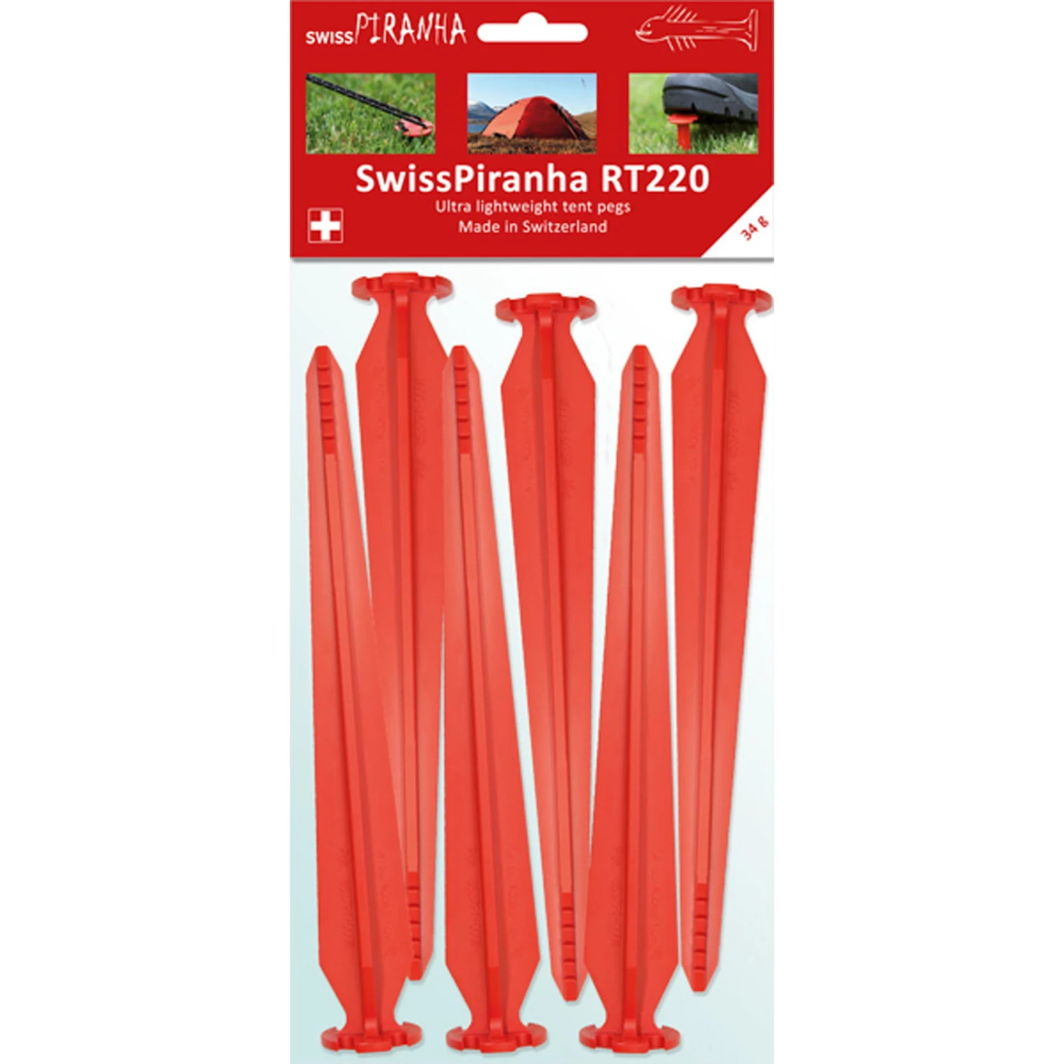 Die RT220 von SwissPiranha sind federleichte, stabile Kunststoff Zeltheringe und bestens geeignet für Schnee, harte wie auch weiche Böden. Die Heringe können für größere Zelte, Tarps, Vorzelte, Pavillons, Abdeckplanen, Lavvus und Tipis, etc. verwendet werden. Die RT220 aus der RedTrout-Serie von SwissPiranha werden aus dem Hochleistungskunststoff PiranhaNT hergestellt. PiranhaNT ist vollständig recycelbar und basiert auf PC + ABS, einem schlagfesten Thermoplast mit ausgezeichneter Strömungs-, Schlag- und Wärmebeständigkeit und Duktilität bei niedrigen Temperaturen. Die Herstellung liegt in der Schweiz und der Hochleistungskunststoff benötigt einen bis zu 13-mal geringeren Energieaufwand für die Herstellung als Heringe aus Aluminium.