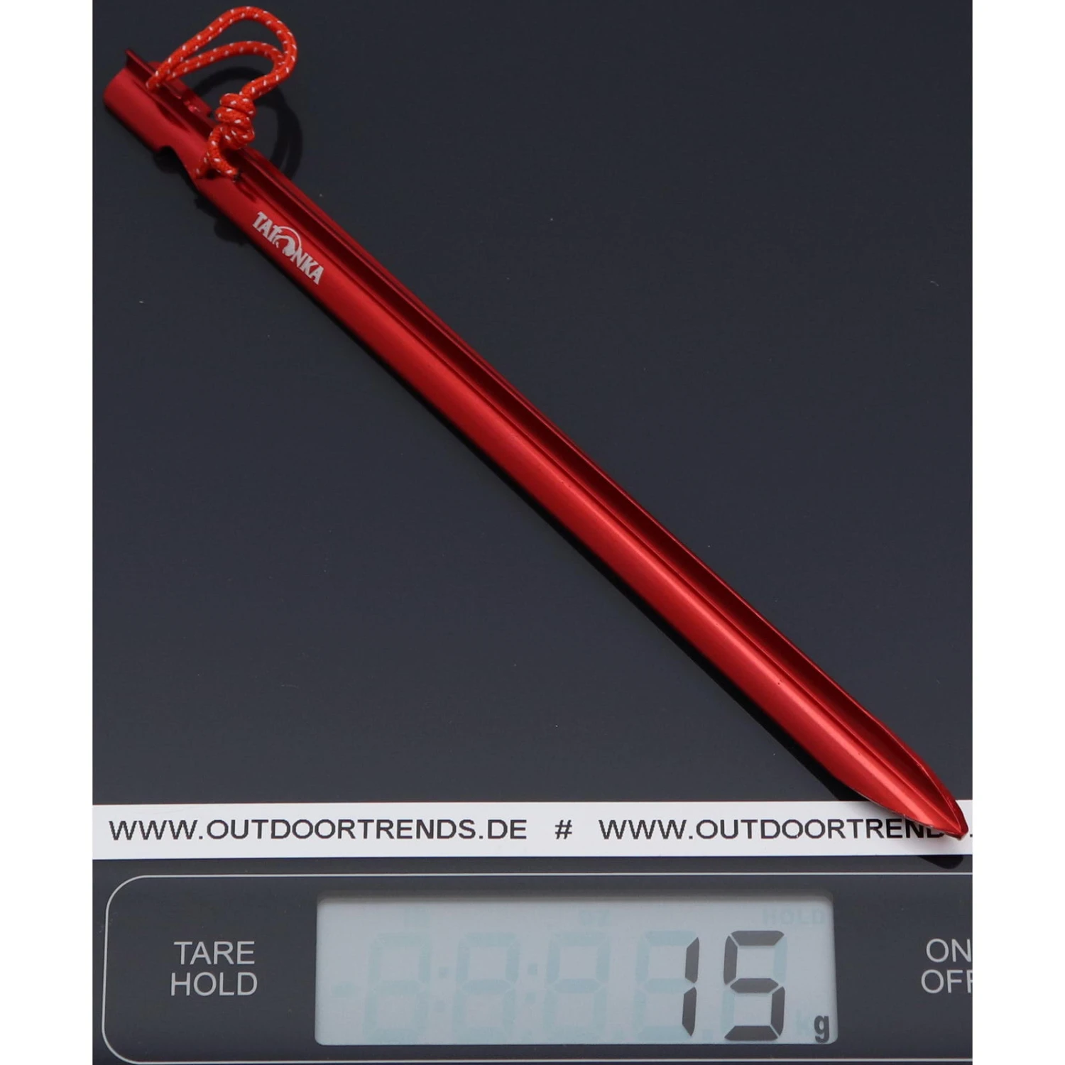 Der leichte Aluminium-Zelthering Tent Peg Pro 19 von Tatonka besitzt ein Y-Profil. In gut sichtbarem rot und mit Schlaufe zum Herausziehen. Erhältlich im 6er-Pack.